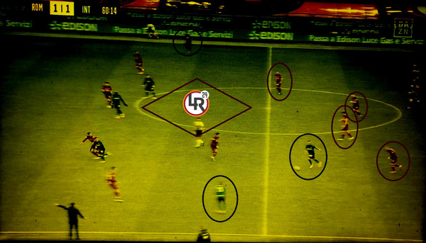La strategia elaborata nello spogliatoio degli ospiti dell’Olimpico domenica è minuziosa e quasi rivelatrice delle debolezze scovate da Conte nella Roma. Il piano è il seguente: prima costruzione con 4 giocatori e non più con gli atavici 3, a rendere innocue le già fragili, per natura e caratteristiche individuali, prime pressioni dei giocatori più offensivi della Roma. Brozovic utilizzato come esca per allontanare e disinnescare la ferocia di Veretout, che gli aveva dato la caccia per tutto il primo tempo. Sviluppo sul lato sinistro, sovraccaricato per isolare Hakimi lasciato in massima ampiezza opposta, ricerca della rifinitura centralmente, zona già svuotata in precedenza dal controllo del numero 17 romanista, per poi finire proprio dalla fuoriserie pagata al Real Madrid 40 milioni di euro in estate.