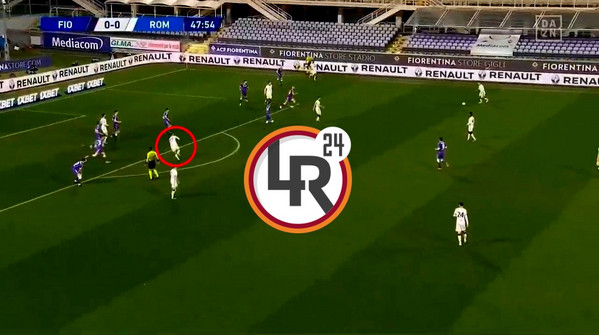 Faticando a ricercare le linee interne che spesso azionano le combinazioni offensive della Roma, le zone di rifinitura, quelle da cui provengono gli ultimi passaggi, sono spostate altrove. Difficile rinunciare all'attacco alla profondità, invece, spesso condizione necessaria e sufficiente per un'azione pericolosa. Si può modificare, e qui si entra nella strategia, il modo in cui questo avviene. E così quella zona alle spalle dei difensori può essere attaccata non più con giocatori in prossimità dell'ultima linea, come spesso avviene con Mayoral, ma con inserimenti più lunghi, che facilitano uno "sconto" sulla rigidità della marcatura. Lo mette in scena Spinazzola, che come si nota nel fermo immagine, si preoccupa di prendere informazioni sul comportamento della linea della Fiorentina, per poi sfoderare l'attacco al settore profondo alle spalle del centrale e del terzo di difesa viola. L'abilità tecnica dell'esterno, va specificato, consente di collegare la teoria alla pratica.