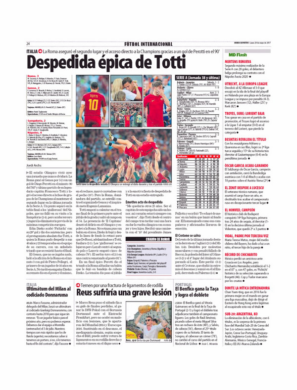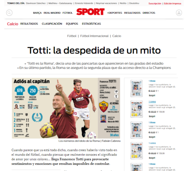 Si è chiusa ieri la carriera da giocatore nella Roma di Francesco Totti. La celebrazione finale ai 25 anni di carriera del capitano giallorosso trova, come prevedibile, una vasta eco anche al di fuori dei confini nazionali. E il numero 10 trova parole d'elogio per la sua straordinaria carriera sulle pagine delle principali testate straniere.