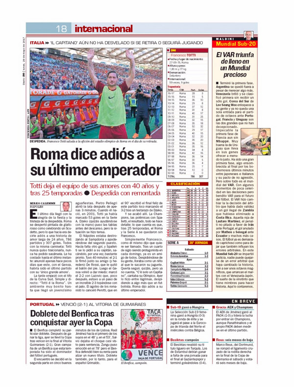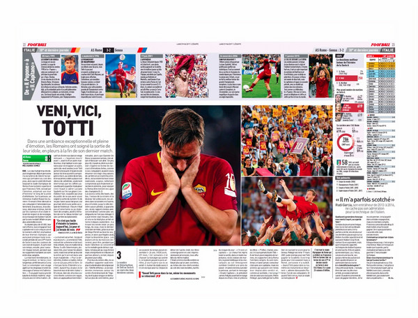 "Veni, vici, Totti", titola il quotidiano francese L'Equipe. "La Roma dice addio all'ultimo imperatore", è invece l'apertura dello spagnolo As. "Un addio emozionante", per gli inglesi del Daily Mail. Un addio "epico" per il Mundo Deportivo. Il portale web brasiliano globoesporte.com apre con un "Ciao capitano", invece, una rassegna delle foto della serata di ieri. Le lacrime del Capitano vengono invece messe in primo piano dall'argentino Olè, che titola "Quando un imperatore piange" il pezzo dedicato all'ultima gara in giallorosso del capitano