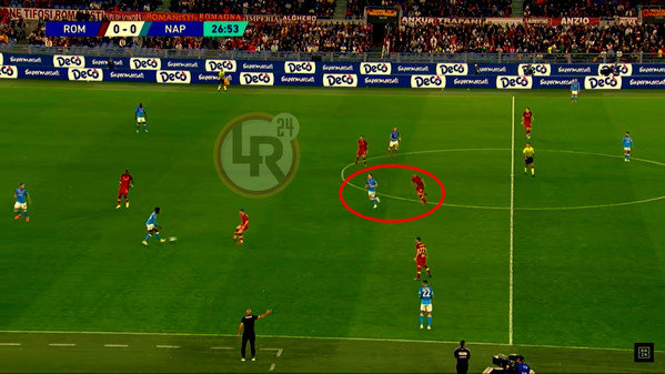 Così anche domenica, quando nella mezz'ora iniziale, la Roma ha sganciato i propri mediani al confine della costruzione del Napoli. Proprio da quest'interpretazione nasce quella che sarà, ai conti finali, l'occasione migliore della partita.