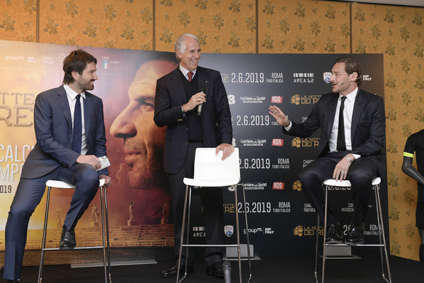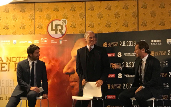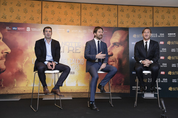 DA VIA GEROLAMO FRESCOBALDI EMANUELE ZOTTI - E' andata in scena alle 12.30 la conferenza stampa di presentazione de "La Notte dei Re", la partita a scopo benefico che si terrà il prossimo 2 giugno allo Stadio del Tennis del Foro Italico, con l'intero incasso che sarà devoluto all'ospedale "Bambin Gesù" per la cura dei bambini affetti da tumori. Alla "Sala Ruspoli" del Parco dei Principi Grand Hotel, presenti Francesco Totti, Luis Figo, Malagò, Candela, Aldair e Di Biagio.