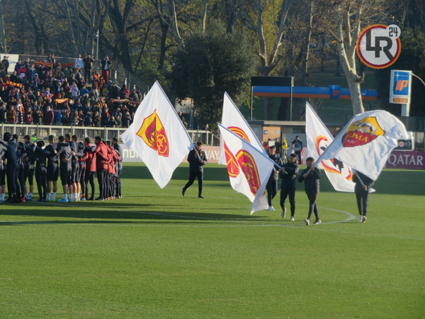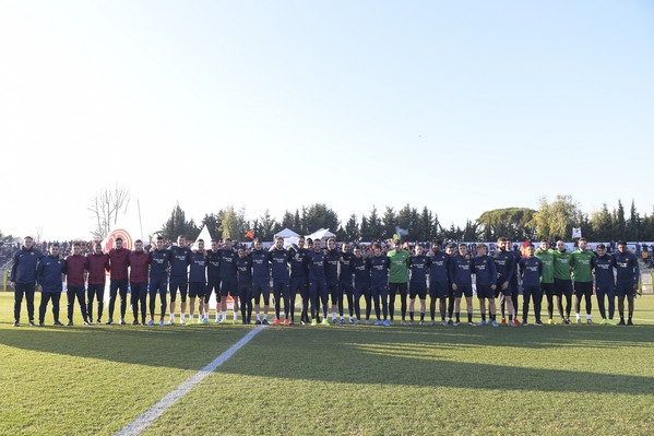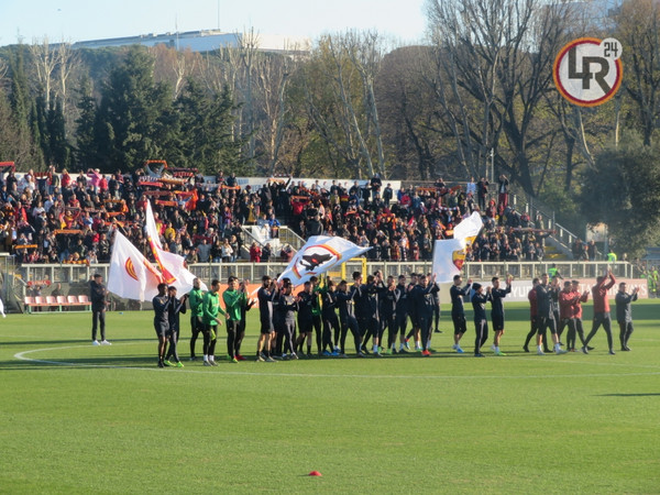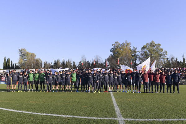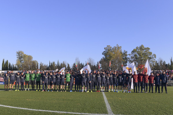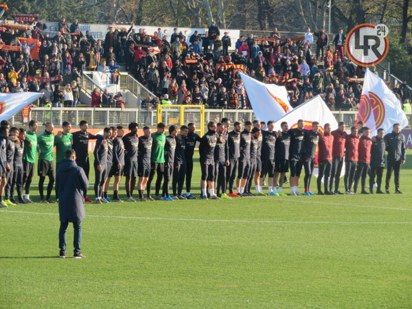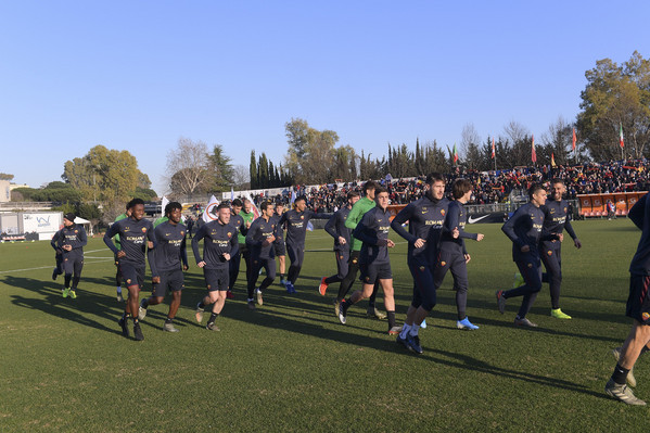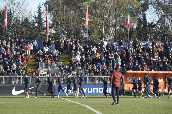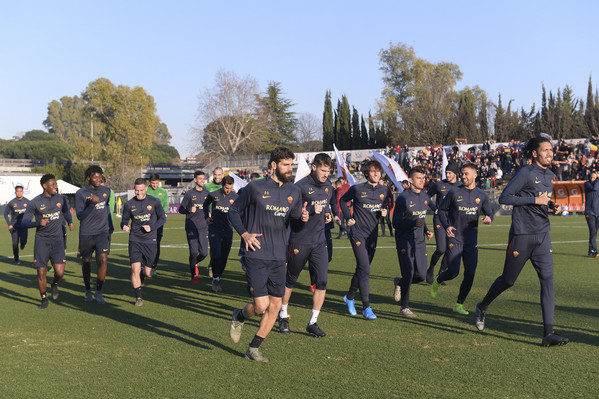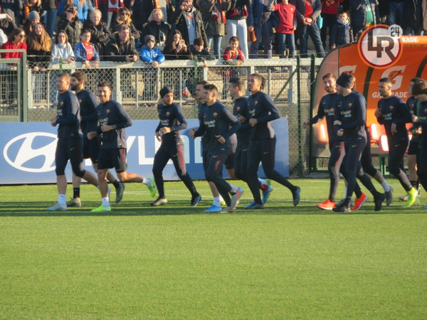 15.20 - La squadra entra in campo e dopo il saluto iniziale ai tifosi verso le due tribune inizia i giri di campo e la riatletizzazione. Alcuni ragazzi delle giovanili hanno sventolato delle bandiere con tutti gli stemmi della storia dell'As Roma. In tribuna ad assistere all'allenamento presenti Petrachi e Fienga.