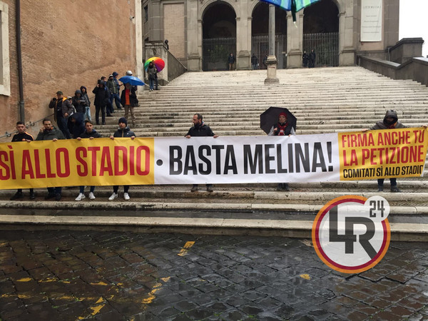 16.00 - Iniziano ad arrivare i primi tifosi, circa 50 dispersi peró dalla pioggia, che espongono uno striscione a favore dello stadio: "Basta melina"