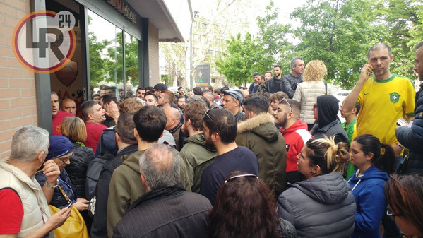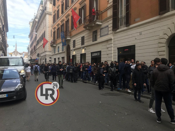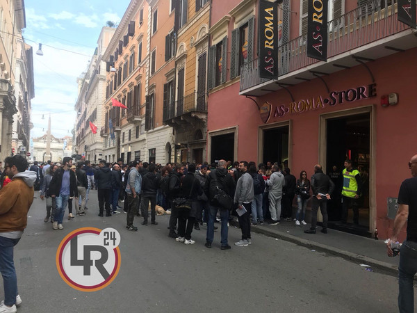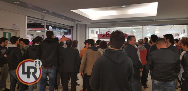 11.00 - Nello store di Via Arenula la coda accumulata invade ormai tutto il marciapiede con centinaia di tifosi in attesa di poter comprare un biglietto.