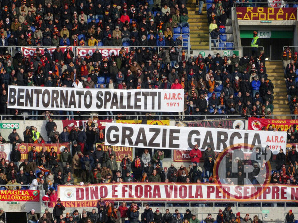 "Bentornato Spalletti" e "Grazie Garcia". Questi i due striscioni esposti in Tribuna Tevere da alcuni tifosi giallorossi per onorare il passato e il presente sulla panchina giallorossa. Striscione importante anche per l'ex presidente della Roma e sua moglie: "Dino e Flora Viola per sempre nei nostri cuori"
