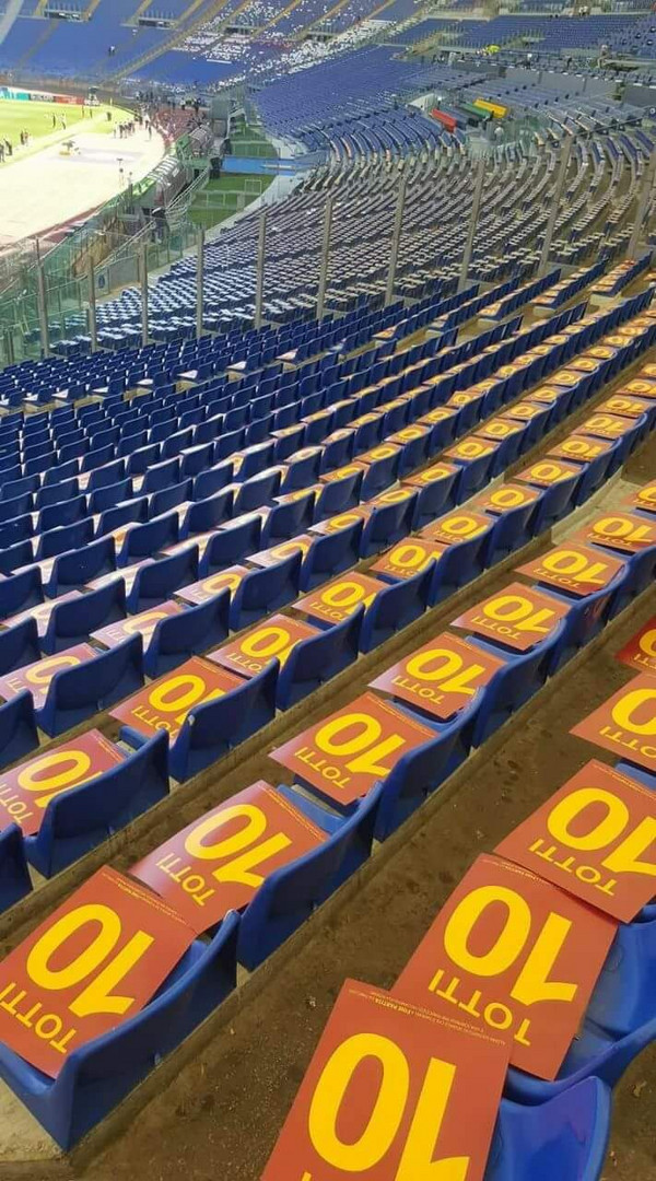 A poche ore da Roma-Genoa e dall'ultima gara in giallorosso di Francesco Totti trapelano i primi dettagli sulla coreografia organizzata per omaggiare il capitano. Sui seggiolini dello stadio sono stati disposti dei cartoncini rossi con il numero 10 e il nome 'Totti'.