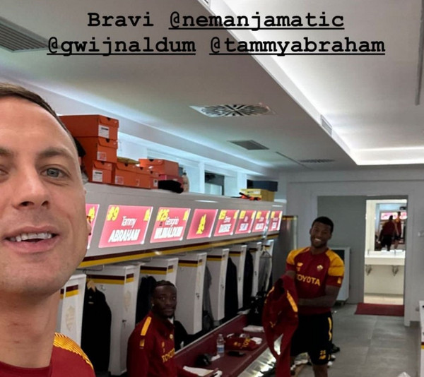 Aria molto serena a Trigoria. I giallorossi hanno appena terminato l'allenamento di rifinitura in vista della sfida contro il Bologna, in programma domani alle ore 18, e si sono divertiti nello spogliatoio. Nemanja Matic, infatti, ha rubato il telefono a Paulo Dybala e ha riempito la galleria della 'Joya' scattandosi dei selfie Tammy Abraham e Georginio Wijnaldum.