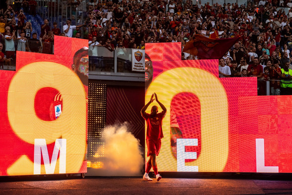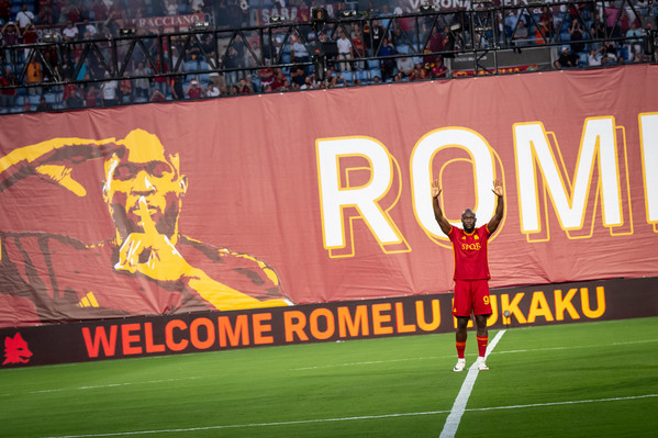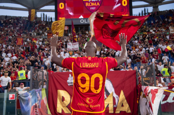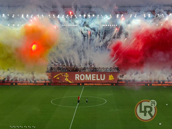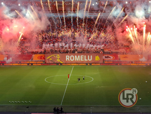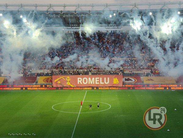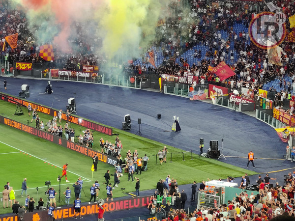 Ovazione e cori per Romelu Lukaku, che fa il suo primo ingresso in campo da nuovo calciatore della Roma, con la maglia numero 90. Coreografia a bordo campo, fumogeni giallorossi e ovazione del pubblico. Poi l'attaccante giallorosso si è spostato sotto la Curva Sud dove il pubblico ha urlato il suo nome.
