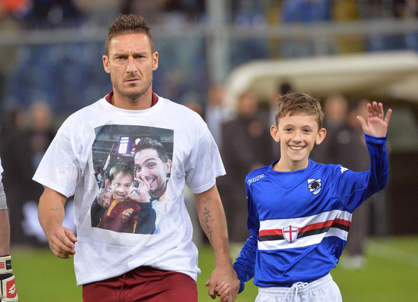 I calciatori della Roma sono entrati in campo indossando una maglietta con la foto di Stefano e Cristian De Amicis, padre e figlio tifosi della Roma, morti in un incidente stradale martedì sera di ritorno dalla partita di Champions Roma-Bayern.