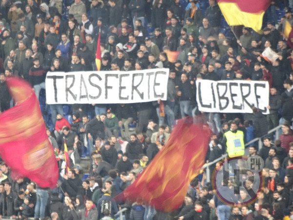 I tifosi della Roma tornano a prendere posizione in merito alla questione delle trasferte vietate alla tifoseria giallorossa, come avvenuto di recente per le gare con Udinese e Napoli. Durante il match con il Torino sono stati esposti alcuni striscioni in Curva Sud. "Trasfette libere", recitava uno di questi. "Diffidati giallorossi", il testo di un altro, 'sormontato' da altri striscioni con impressi i nomi dei sostenitori giallorossi colpiti da provvedimento di diffida.