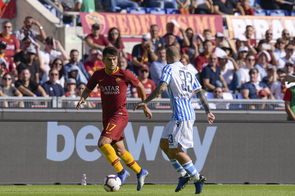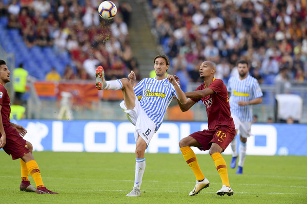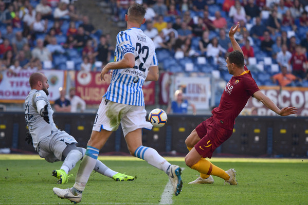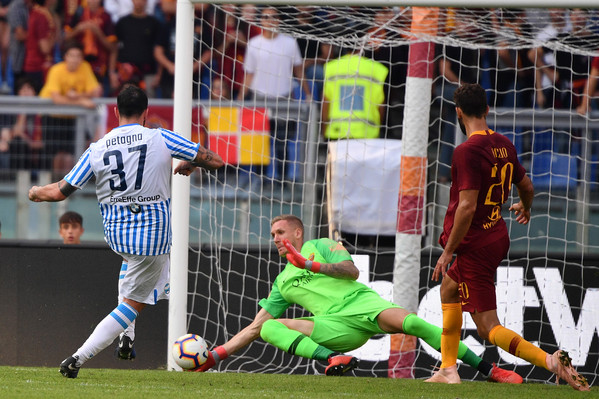 Un primo tempo bloccato dove la Roma sostanzialmente domina dal punto di vista del possesso palla e delle occasioni ma non riesce a sbloccare la partita. Ci provano in successione Dzeko e Florenzi, ma senza successo. La Spal fa densità nella propria metà campo ed è pronta a ripartire in contropiede. Proprio da una di queste ripartenze si concretizza l’episodio che cambia la partita. Luca Pellegrini spinge in area Lazzari, Pairetto indica il dischetto. Il primo tiro in porta della Spal arriva su calcio di rigore, Petagna spiazza Olsen e sigla l’1-0 per i ferraresi.