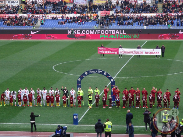 14.22 - La Roma entra in campo per svolgere il riscaldamento nel prepartita, preceduta poco prima dal Torino.