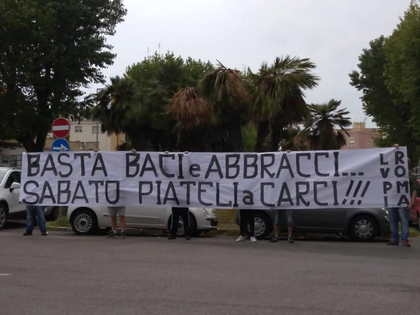 Riscatto immediato dopo l'ennesima brutta figura. All'indomani del ko con l'Inter, i tifosi della Roma rivolgono un chiaro messaggio alla squadra giallorossa in vista del derby di sabato prossimo con la Lazio. Un messaggio firmato dal gruppo Lupi della Curva Sud, che ha realizzato uno striscione del quale circolano alcuni scatti sul web: «Basta baci e abbracci - recita la scritta -, sabato piamoli a carci»