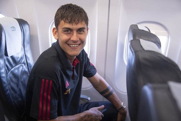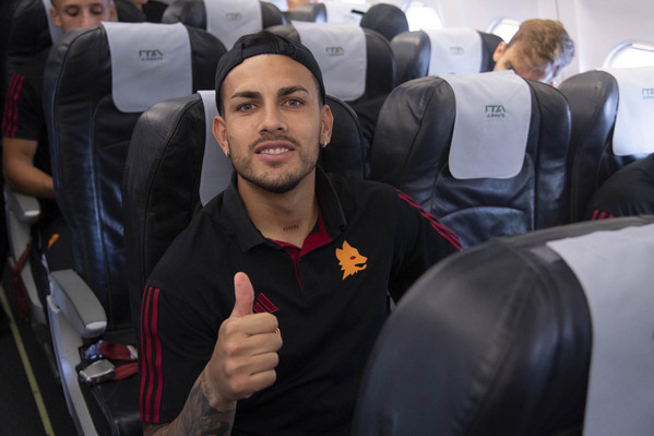 18.15 - La Roma è in partenza per raggiungere Torino in aereo. Autografi anche su una maglia dell'Argentina per Leandro Paredes e Paulo Dybala all'esterno dell'aeroporto.