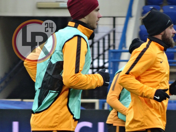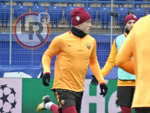 La Roma scende sul terreno di gioco dello Stadio Metalist di Kharkiv per svolgere la rifinitura in vista della gara contro lo Shakhtar Donetsk. Come spiegato in conferenza stampa dal tecnico Eusebio Di Francesco, Alessandro Florenzi è in dubbio per il match di domani sera e non si sta allenando con i compagni a causa di un problema intestinale. A causa del freddo pungente, i giocatori hanno svolto un lungo riscaldamento muscolare prima di dedicarsi ad alcune esercitazioni tattiche e ad una partitella a campo ridotto. Sul terreno di gioco, oltre a giocatori e staff tecnico, presenti anche Federico Balzaretti, il direttore sportivo Monchi, il direttore generale Mauro Baldissoni e Francesco Totti.