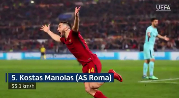 La Uefa ha pubblicato la Top 10 dei giocatori più veloci dell'ultima edizione della Champions League: in classifica, comandata da Momo Salah, al quinto posto è presente anche il difensore della Roma Kostas Manolas con una velocità registrata di 33.1 km/h