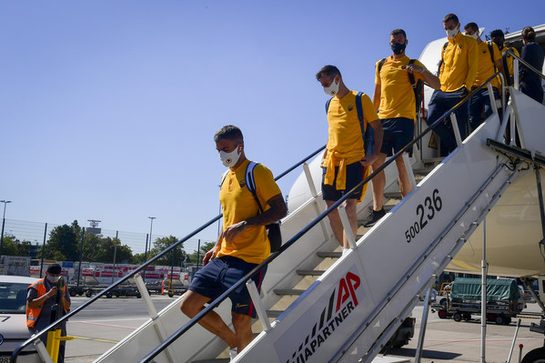 Giocatori e staff tecnico si sono imbarcati dal Terminal T5, blindato per le norme di sicurezza anti-Covid. Con la squadra partono anche i dirigenti: presenti il vice-presidente Mauro Baldissoni e il CEO Guido Fienga, oltre al team manager Manolo Zubiria.