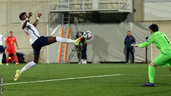 Tammy Abraham completa o cruzamento de Sancho e anota o terceiro gol da Inglaterra sobre Andorra.