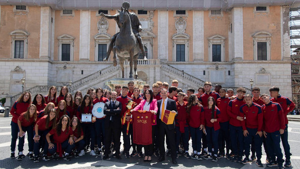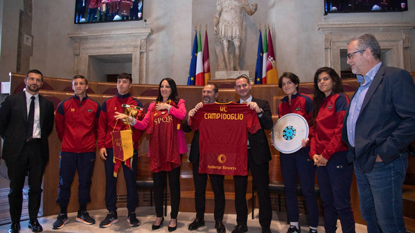 Questa mattina le squadre maschile e femminile della Roma Primavera sono state premiate in Campidoglio nell'Aula Giulio Cesare dalla Presidente dell’Assemblea Capitolina Svetlana Celli e dai consiglieri capitolini Daniele Parrucci e Federico Rocca. La formazione maschile ha conquistato la Coppa Italia, mentre la femminile il campionato. Durante l'evento sono intervenuti anche il consigliere Nando Bonessio e i dirigenti della Roma Francesco Pastorella, Vincenzo Vergine e Betty Bavagnoli.