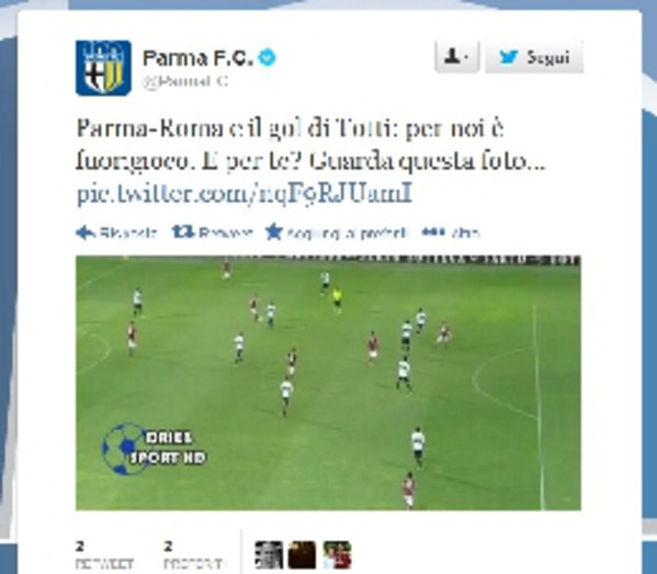 Twitter, il Parma non ci sta: "Gol di Totti in fuorigioco"