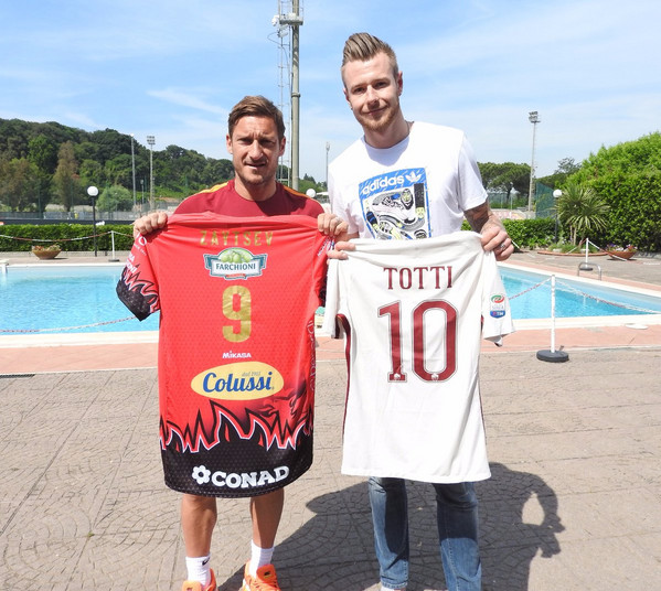 Sul suo profilo Twitter, Francesco Totti ha pubblicato un'immagine che lo ritrae in compagnia del campione di pallavvolo Ivan Zaytsev. I due si sono incontrati questa mattina al centro sportivo di Trigoria: "9 e 10: coppia d'attacco fatta! Grande Ivan Zaytsev, è stato belli incontrarti!"