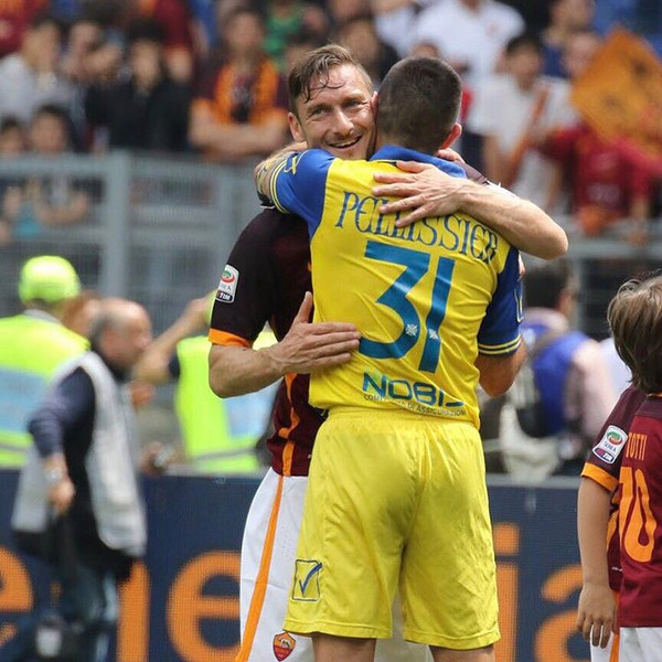 Il Chievo Verona, tramite il proprio account Twitter ufficiale, ha pubblicato una foto che ritrae Francesco Totti e Sergio Pellissier, insieme, durante l'ultimo match di campionato giocato dalla Roma al Bentegodi e vinto dai giallorossi per 5-3. Questo il post pubblicato dalla società clivense: "Due uomini, due capitani, due bandiere, 357 gol in Serie A, tutti con due sole maglie! La storia è tutta qua… Leggende!".