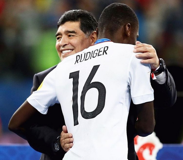 Diego Armando Maradona ieri era in Russia per assistere dal vivo alla finale di Confederations Cup tra Germania e Cile, Oggi Antonio Ruediger, difensore tedesco della Roma ha pubblicato una foto in compagnia del Pibe de Oro accompagnata da questo messaggio: "Uno dei più grandi di sempre"