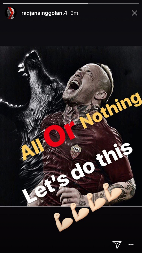 A qualche ora dalla decisiva sfida di ritorno degli ottavi di finale di Champions League contro lo Shakhtar, il romanista Radja Nainggolan si carica attraverso una "storia" su instagram: "Tutto o niente. Facciamolo!" Ha scritto il belga postando anche una foto di una sua esultanza accanto ad un lupo