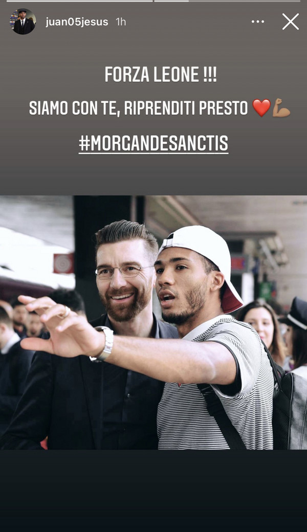 In mattinata la notizia dell'incidente di Morgan De Sanctis, avvenuto ieri sera con successivo intervento al Gemelli, ha scosso l'ambiente giallorosso. E su Instagram il difensore Juan Jesus ha mostrato vicinanza e affetto al ds della Roma: "Forza leone!!! Siamo con te, riprenditi presto", è il messaggio affidato ai social, accompagnato da uno scatto dei due.
