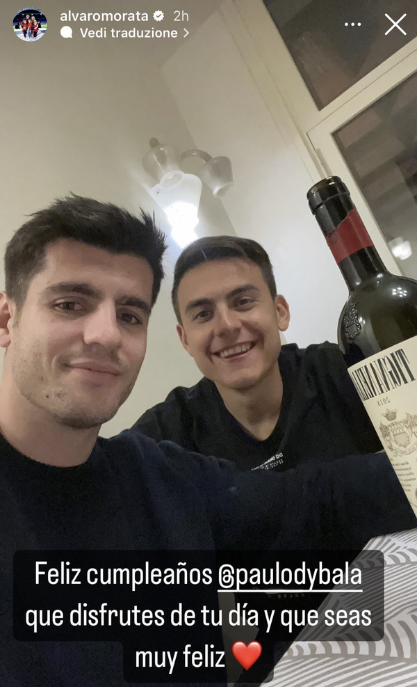 "Buon compleanno Paulo, goditi questa giornata e spero tu sia felice": con questo messaggio su Instagram Alvaro Morata dedica un messaggio di auguri a Paulo Dybala, che oggi spegne 30 candeline. L'attaccante dell'Atletico Madrid, ex compagno della Joya alla Juventus, ha anche assistito alla proposta di matrimonio di Dybala alla fidanzata Oriana Sabatini a Fontana di Trevi qualche giorno fa.