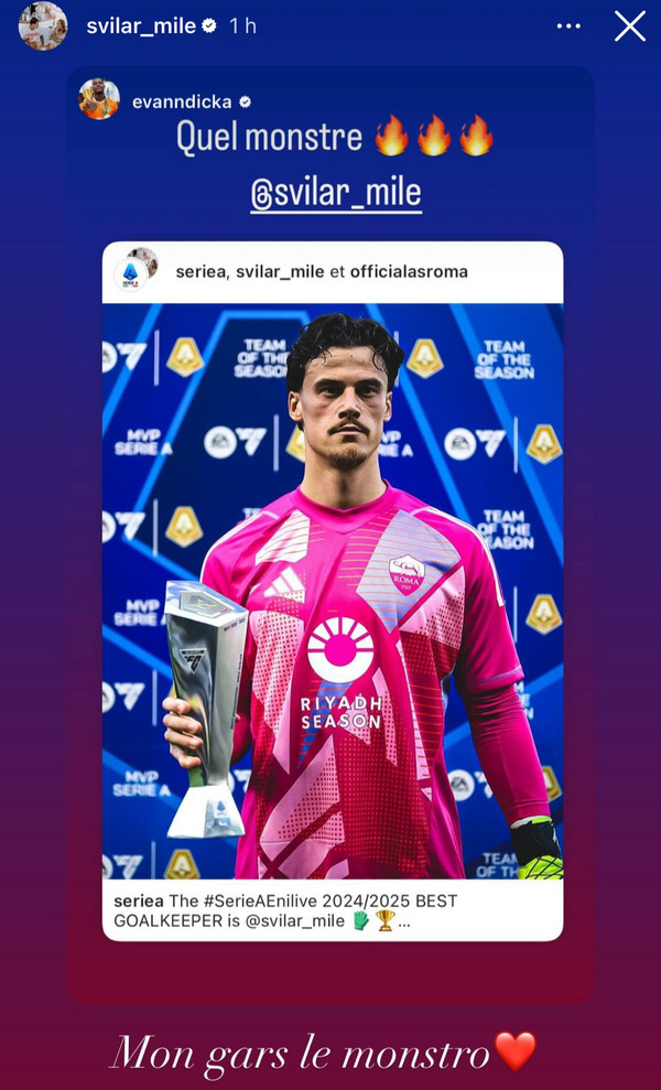 Mile Svilar è stato nominato "Miglior portiere della Serie A 2024/25" e ha ricevuto il premio in occasione della sfida contro il Torino, valida per l'ultima giornata di campionato. Il portiere è stato spesso decisivo nel corso della stagione ed Evan Ndicka lo ha esaltato in una storia Instagram: "Che mostro". Immediata la risposta dell'estremo difensore, che ha contraccambiato il complimento: "Il mio compagno è il mostro".