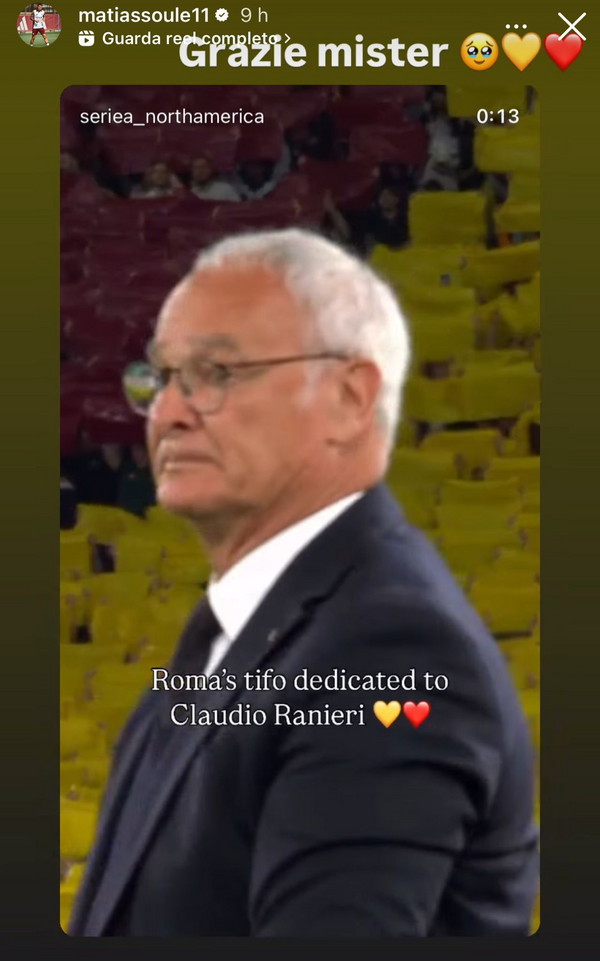 Roma-Milan ha segnato l'ultima partita di Claudio Ranieri allo Stadio Olimpico da allenatore giallorosso e i tifosi lo hanno celebrato con una splendida coreografia e tantissimi cori e striscioni. Al termine della gara anche la squadra ha festeggiato il mister con il classico 'pasillo de honor' e una statua della lupa capitolina consegnata dal capitano Lorenzo Pellegrini. Su Instagram Matias Soulé ha voluto dedicare al tecnico una storia: "Grazie mister", il messaggio accompagnato dall'emoji di una faccia emozionata e i cuori giallorossi.