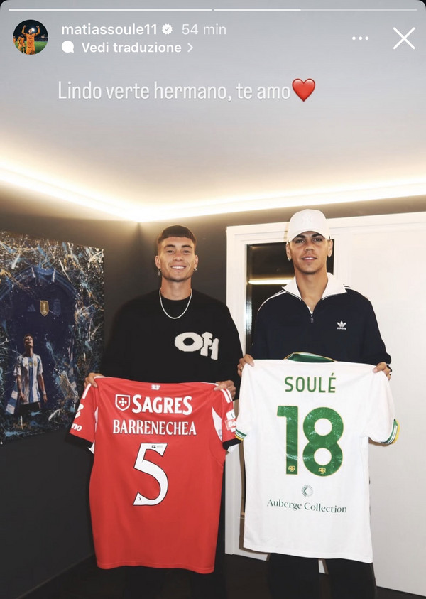 Matias Soulé ritrova Enzo Barrenechea. L'attaccante della Roma ha condiviso una foto su Instagram che lo ritrae con il centrocampista, attualmente al Benfica, e suo ex compagno nella Juventus. "Bello vederti amico, ti voglio bene", il commento di Soulé al momento dello scambio di maglia con Barrenechea.
