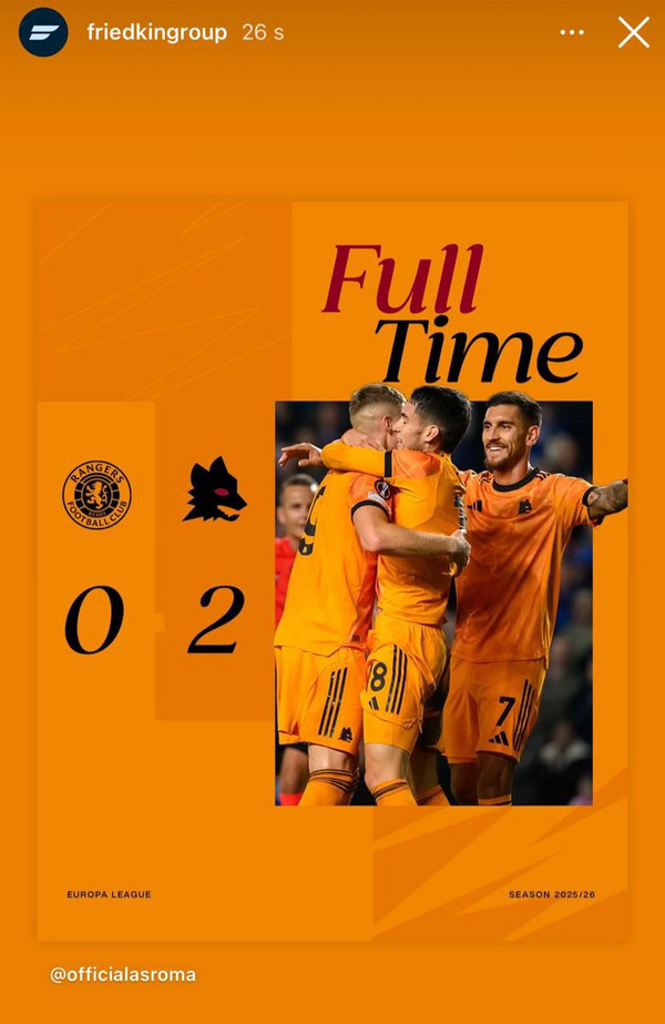 La Roma torna a vincere in Europa League e sono tre punti fondamentali per lanciare la rincorsa in classifica. Lo 0-2 rifilato agli scozzesi dei Rangers è stato celebrato anche dai Friedkin, che tramite il proprio profilo Instagram ha deciso di ripubblicare tra le storie, la foto del risultato finale del match.
