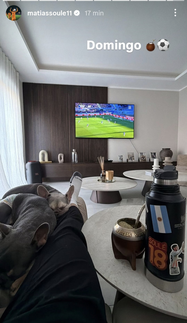 Meritato riposo dopo l'assist e il gol di ieri per Mati Soulé. L'argentino ha pubblicato una storia Instagram nella quale è ritratto allungato sul divano, in compagnia dei suoi due cani, l'immancabile mate e la Serie A sullo sfondo, con Fiorentina-Milan. Da notare la bottiglia con i colori della Roma e la bandiera dell'Argentina.