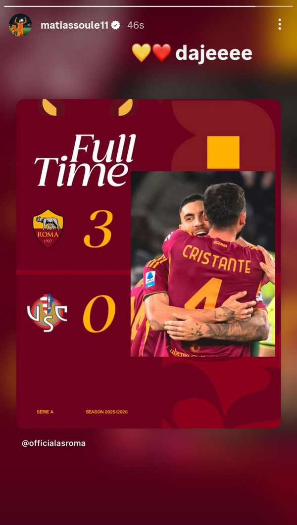 Lontano dal campo per gestire la pubalgia che lo ha tenuto fuori dai convocati, Matias Soulé fa mancare il suo supporto alla Roma. Pochi istanti dopo il triplice fischio che ha sancito il netto 3-0 sulla Cremonese, l'attaccante argentino ha celebrato la vittoria sui social. Tramite una storia pubblicata sul suo profilo, Soulé ha ricondiviso la grafica del risultato finale accompagnandola con un semplice "daje", seguito dai cuori giallorossi.