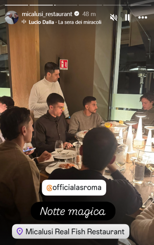 Cena di squadra per la Roma. I giallorossi sono a cena in centro, non lontani da Castel Sant'Angelo, al ristorante "Micalusi - Real fish restaurant". I giocatori sono seduti a tavola, come mostrato dall'account Instagram del ristorante, disposti in gruppi. Presente anche mister Gasperini: "Lui è veramente un grande", il commento allo scatto da parte dell'account IG del locale.