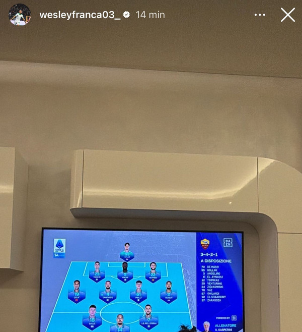 Uno dei grandi assenti di Inter-Roma, sponda giallorossa, è senza dubbio Wesley, infortunatosi in nazionale. Il terzino, brasiliano, sta seguendo comunque la gara da casa, come dimostra l'ultima storia postata sul suo profilo Instagram.