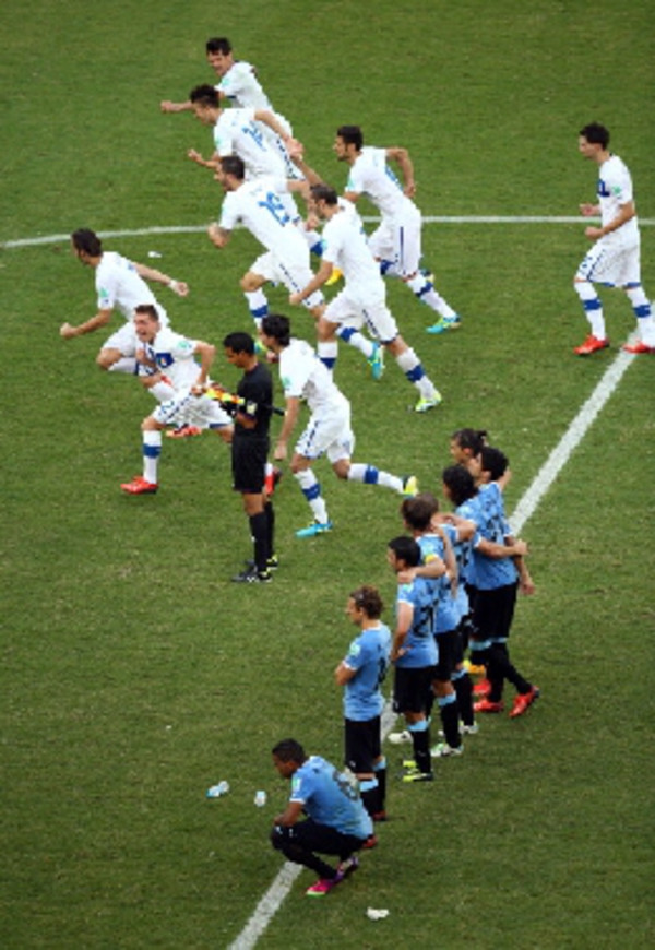 LItalia, dopo un discreto primo tempo chiuso in vantaggio con la prima rete azzurra di Astori, cala e di brutto nella ripresa. L1 a 0 arriva da una punizione di Diamanti, battuta in modo efficace da posizione decentrata: palo, palla sulla schiena di Muslera che si fa sorprendere dalla traiettoria e tocco facile di Astori a porta vuota. Da 40 anni un giocatore del Cagliari non segnava in nazionale, lultimo fu Gigi Riva, il re dei nostri cannonieri, nellottobre del 73 alla Svizzera. Ma proprio Astori, uscendo dallarea azzurra, offre la ripartenza breve allUruguay: Gargano imbuca per Cavani che pareggia per la prima volta al tredicesimo del secondo tempo. Il 4-3-2-1 di Prandelli sta diventando fragile: Diamanti fa il suo da fermo e bisogna dirgli grazie, ma Gilardino non tiene un pallone ed El Shaaravy evapora. Il centrocampo è ormai senza energie: De Rossi esce, spazio ad Aquilani, Candreva va a sprazzi e Montolivo, ora regista, è stremato. Buffon, prima del gol di Diamanti e del bis di cavani, evita lo svantaggio: doppia parata su Forlan. LItalia, con un giorno di riposo in meno e due supplementari in più, è stanca, ma lUruguay non ne approfitta. Nemmeno quando Montolivo, allinizio del secondo supplementare, lascia i compagni in dieci (doppio giallo). Il ct azzurro passa al 4-4-1, chiedendo a El Shaarawy di sacrificarsi da esterno a sinistra. Giaccherini, entrato per Diamanti, offre corsa e pressing, Bonucci, in campo per Astori, risolve un paio di situazioni da brividi. Il suo compito finisce lì. Non calcia il rigore come a Fortaleza. Buffon chiude la pratica prima di farlo cadere in tentazione (era il settimo).