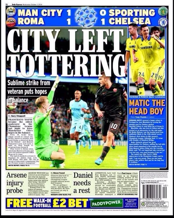 One man show. Protagonista assoluto, della gara di ieri sera e delle prime pagine di oggi. Anche in Inghilterra. Totti campeggia su tutti gli inserti sportivi dei principali tabloid inglesi, una celebrazione di una leggenda che ieri è entrato nella storia della Champions. ‘Vintage Totti’ titola il Daily Telegraph, ‘Not again!’ apre il Daily Mail. Per il Mirror, ‘Tottering’, ossia ‘barcollando': un bel gioco di parole per esaltare il n.10 giallorosso e rappresentare la situazione del City nel girone. Stesso gioco di parole usato dal Daily Express, che titola ‘City left Tottering’. Sul Times, infine, ‘Totti has City playing catch up’. La patria del football rende onore all' "eternal footballer" come lo definisce il Sun. Per il Guardian il capitano romanista è "un veterano dotato di una classe senza tempo", mentre il Daily Star lo definisce "Italian Maestro"