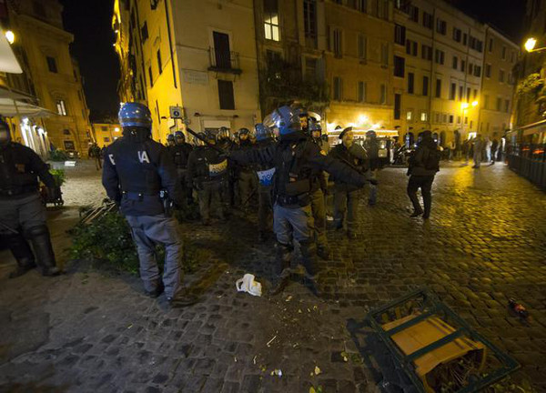 Tante le segnalazioni arrivate alle forze dell’ordine, sul posto cinque blindati di polizia e carabinieri in assetto antisommossa. Intorno alle 20.30 è stata necessaria una carica di alleggerimento degli agenti sui circa mille olandesi in evidente stato di ubriachezza che, dopo aver lanciato le bottiglie contro i poliziotti, hanno provato a disperdersi nelle vie circostanti. Una ventina i fermati. «Mille tifosi ubriachi del Feyenoord stanno assediando Campo de’ Fiori, urinando e tirando bottiglie di vetro. Io e altri negozianti - ha raccontato Fabrizio Roscioli, titolare di un panificio all’ombra della statua di Giordano Bruno - siamo stati costretti a chiudere. Il quartiere è ostaggio dei tifosi olandesi che hanno iniziato a bere dalle 14. La fontana è piena di bottiglie, sono indignato. Rimango dentro al negozio chiuso per paura che venga sfasciato».