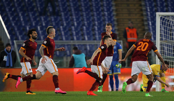 Come riporta il quotidiano sportivo, contro il Frosinone Spalletti disegna un 3-4-2-1 inconsueto, con Rudiger chiamato a fare (bene) l’esterno di fascia destra (e poi sinistra) ed El Shaarawy, sull’altro versante, più in alto per appoggiare – alle spalle di Dzeko – Salah e Nainggolan, chiamato spesso a rinforzare la mediana. La mossa non è banale perché il Frosinone decide di pressare su tutte le rimesse dal fondo della Roma senza però alzare troppo la difesa; ne consegue che tra le linee gli spazi non mancano, tant’è che i ragazzi di Spalletti hanno diverse ripartenze potenzialmente pericolose. La squadra di Stellone, invece, punta forte sui calci piazzati e al 17’ è Zukanovic a salvare sulla linea un gol quasi certo di Frara. Nel momento in cui balla la Roma però passa, perché Nainggolan, servito da Pjanic, segna da terra con un destro che trova Leali impreparato, tra le proteste dei gialloazzurri, che segnalano Salah in fuorigioco vicino alla linea di tiro. E’ il 18’ e sembra l’inizio di una goleada, ma 6 minuti più tardi una ripartenza di Chibsah lancia Ciofani che supera Zukanovic e batte Szczesny. La ripresa si apre col vantaggio giallorosso: Zukanovic al 3’ crossa da sinistra ed El Shaarawy è bravissimo ad anticipare Ajeti di tacco. Al trionfo mancherebbe Dzeko, che però al 4’ sciupa da buona posizione e dopo poco viene addirittura sostituito. La Roma passa allora al 4-3-3, mentre nel finale saranno i gialloazzurri a tentare il 4-2-4. A dire il vero ne viene fuori più fumo che arrosto, finché Totti al 39’ non lancia Pjanic per il tris.