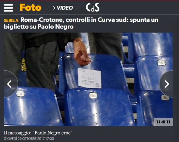 Al termine di Roma-Crotone gli agenti della Polizia hanno passato al setaccio la Curva Sud, dove nel weekend precedente i tifosi della Lazio avevano lasciato adesivi antisemiti tra cui quello di Anna Frank con la maglia romanista che tanto ha fatto discutere. Il "bottino" degli agenti nel settore del tifo giallorosso ha portato alla luce un biglietto con scritto "Paolo Negro eroe".