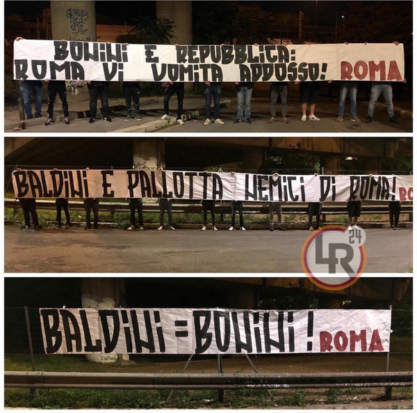 LA REPUBBLICA (F. TONACCI) - L’alito fetido della Roma che non vuole critiche e azzera i fatti lo senti sul collo già mentre scrivi. Ci sono gli argomenti proibiti, in questa città. I totem sacri, gli intoccabili, la Linea. Ecco, la Linea. Quella tracciata ogni mattina dalle nove radio locali, che aprono il microfono al ventre dei romani e ne eccitano gli istinti: ventiquattr’ore al giorno a parlare della Lazio, della Roma, di Roma. Primo comandamento: non si mette mai in discussione la Linea, non va sfiorata. Neanche con la forza del giornalismo di inchiesta, che documenta fatti e circostanze, rivela trame e svela orditi. Un pezzo di città non lo accetta. E quindi lo striscione “Bonini e Repubblica, Roma vi vomita addosso!”. E quindi, ancora, le scritte sui muri della mattina dopo: “Austini, Bonini, Mensurati, chi tocca l’As Roma muore!”. Perché Roma a volte è così, rigurgita di notte quel che mastica di giorno. Ci risiamo. È una storia che è già capitata, e che capiterà ancora.
