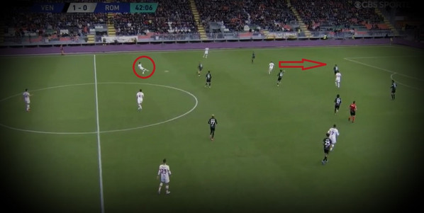 Il tema delle pressioni scarsamente collettive e delle letture difensive necessarie quando queste vengono a mancare o sono saltate è tornato di prepotente attualità sul 3-2 del Venezia, quando una Roma nervosamente rovesciata dall'altra parte, ha mostrato la diacronia tra Cristante e Mancini nell'interpretazione. Uno, infatti, lo si vede correre verso la propria porta in una disperata scappata difensiva, l'altro tenta di rifugiarsi nel fuorigioco. Pericolosamente, appunto, anche qui.