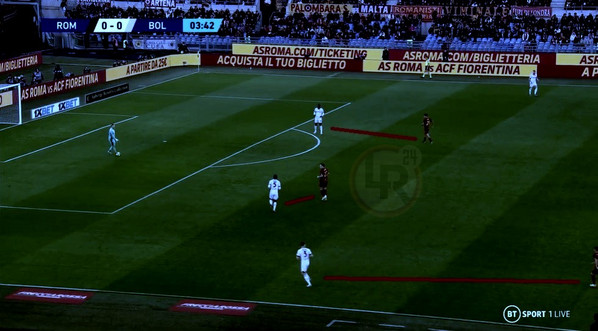 Le trappole seminate per il campo offrono la preda a tiro dopo neanche 4 giri di orologio: quando Skorupski tenta di saltare una linea in costruzione, trovandosi un 4 contro 4 davanti per l'opposizione "one to one" dei giallorossi, per raggiungere Orsolini che nel frattempo si era abbassato, si nota il tessuto collettivo della pressione. Qui, infatti, c'è Ibanez a continuare a tenere la scia del 7 del Bologna, costretto così a compilare la propria giocata con il fiato addosso del romanista. Risultato: Cristante, come Celik, quelli in pressione sul lato divenuto debole, hanno abbandonato il proprio riferimento per posizionarsi diagonalmente al pallone, guadagnando così il possesso. Perché l'orientamento sull'uomo vale fino ad un certo punto, poi serve ostruire le principali vie d'accesso alla porta.