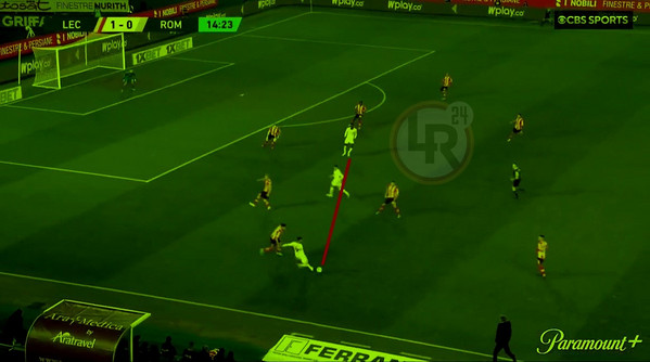 Qui, per conformazione, gli uomini in maglia bianca risultano comunque in netta inferiorità rispetto a quelli posizionati o prossimi al ricomponimento del blocco del Lecce: 4 (i 3 d'attacco oltre al El Shaarawy in possesso) contro 7, oltre a Zalewski che prova a sbrigarsi sulla corsia opposto per allievare le differenze numeriche. Se il vantaggio non può essere numerico, dovrà scaturire inevitabilmente da velocità e qualità di realizzazione dello sviluppo. Ed è quello che accade: dal 2v2 esterno con Pellegrini, El Shaarawy si getta in profondità, con Abraham che s'adegua rapidamente al ruolo di rifinitore e, con 3 passaggi e una manciata di secondi, la giocata al terzo uomo messa in scena splendidamente dalla Roma spalanca ad El Shaarawy le porte del Lecce. Poi c'è Falcone, vero, ma questa è un'altra storia.