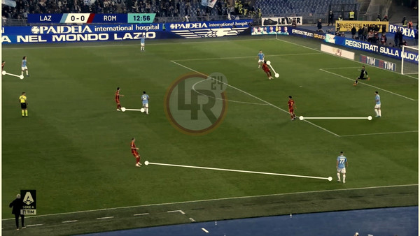 In più, la squadra di Sarri mantiene sempre una discreta rigidità nelle proprie fasi di possesso, con un 4-3-3 facilmente tracciabile in campo, lasciando dunque una certa comodità nell'avversario per modellarsi nelle pressioni. E questo ha facilitato il compito della Roma che mira ad essere una squadra aggressiva anche senza averne i connotati al suo interno, inteso come giocatori che hanno nella riconquista offensiva una delle tendenze preferite. Infatti, anche nel quarto d'ora di domenica, i principali guadagni diretti, quindi contrasti per riconquistare il pallone, sono arrivati da Mancini e Bove. L'altra transizione presa in esame, invece, arriva da un pallone ripreso da Ndicka dopo una giocata errata della Lazio, forzata comunque dalle pressioni portate dalla Roma.