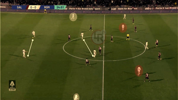 Rispetto alla prima volta, contro il Verona, la Roma ha alzato ancor di più le proprie ambizioni di costruzione passando dal 3+2 che si era visto all'Olimpico a un più frequente 2+2, con Cristante-Bove accoppiati davanti a Llorente e Mancini a guidare le operazioni di uscita dal basso. Con la Salernitana che si sedeva ad altezza media nel campo per poi, però, andare a guastare il primo possesso romanista con pressioni che hanno progressivamente grattato le certezze che la Roma sta cercando di costruirsi.